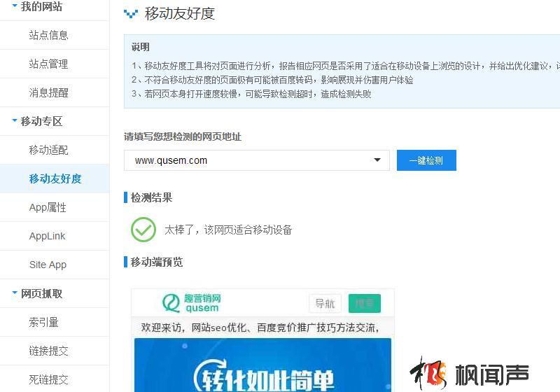 那么,如何知道您的網站是否可以適應移動端,為用戶提供無障礙的瀏覽方式呢,其實花個一兩分鐘檢測一下就可以了,這里我們用到的,是百度站長平臺的移動友好度檢測功能,如果移動友好度不夠,可以點擊了解百度移動網站友好度標準 。