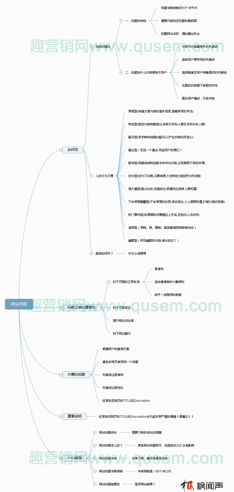 本文內容主要是一張關于網站標題優化的思維導圖,涉及到的知識點非常詳細,包含標題結構、標題內容、人的行為習慣、標題的重要性、作弊的標題、常見問答等,可以說囊括了標題優化的方方面面。