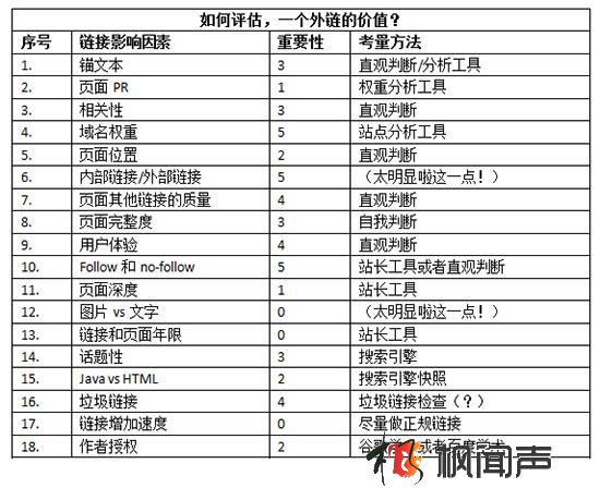 那么我們應(yīng)該從哪些方面考量一個(gè)外鏈?zhǔn)欠褡銐騼?yōu)質(zhì)呢?趣營(yíng)銷(xiāo)網(wǎng)與你分享18個(gè)評(píng)判指標(biāo),讓你輕松判定外鏈?zhǔn)欠駜?yōu)質(zhì)。同時(shí),5星級(jí)評(píng)判標(biāo)準(zhǔn)讓你一目了然的明白,哪些外鏈指標(biāo)的重要性更大。這些都是SEO從業(yè)者多年經(jīng)驗(yàn)匯總的精華,僅供大家參考!