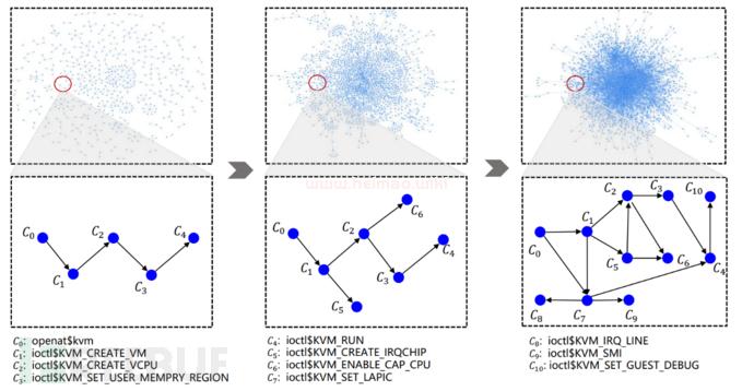 操作系統內核測試需要解決的一個核心問題是高質量調用序列的生成。Healer兼容現有kernel fuzzer的特征,例如, Healer可以直接利用業界廣泛使用的Google Syzkaller的接口描述,來自動生成滿足結構約束和部分語義約束的系統調用序列,從而保證生成的每個調用不被簡單的內核參數檢查拒絕,并通過執行生成的調用序列來觸發內核崩潰、不斷地發現內核漏洞。 但又不同于現有工具,Healer設計實現了高效的算法和框架來優化整個Fuzz流程,例如,Healer通過使用系統調用之間的影響關系來引導調用序列的生成與變異,盡可能地保證調用序列中的前序調用為后續調用設定需要的內核狀態,并通過關系學習算法在運行時不斷精化和發現新的影響關系、優化整個fuzz過程。如下圖所示,關系學習算法實際上在推導一個非常復雜的圖結構,其中每個節點對應一個系統調用,每條邊對應調用之間的影響關系。
