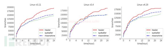 最終效果上,Healer生成的系統調用序列步驟更多、更有效,可以提高每個測試用例達到內核深層邏輯、挖掘深層漏洞的效率。 基于標準對比實驗可以發現,相比于Google Syzkaller、Moonshine等同類工具,Healer可以達到28%以上的覆蓋深度提升、2倍以上的覆蓋速度加速。
