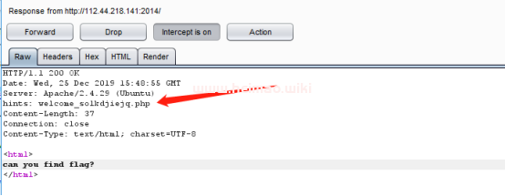 (1)訪問http://112.44.218.141:2014是一個空白頁面,開始想到的就是查看robots,然后御劍目錄掃描都沒有得到有發現目錄;然后就使用burp截包,可以看到提示目錄welcome_solkdjiejq.php