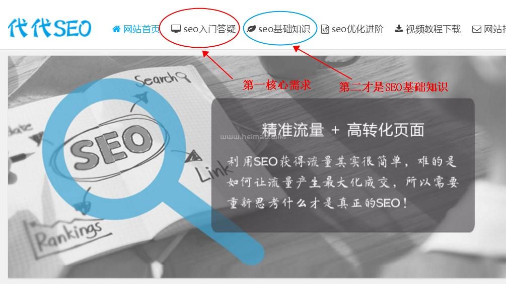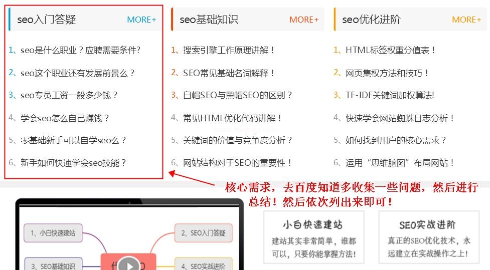 所以想做這個關鍵詞,一定要專門做一個新手答疑板塊,來解答一些新手疑問,引導他們正確認識SEO技術,正確的去學習SEO技能,對吧!所以我們的網站就把SEO入門答疑放到了頁面最前面,因為這是新手的核心需求,然后才是SEO基礎知識!
