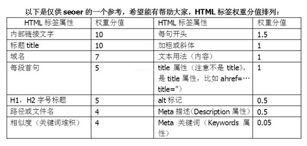 當前位置:首頁 >> 黑帽SEO優(yōu)化 >> SEO技術(shù) >> HTML標簽權(quán)重分值表!