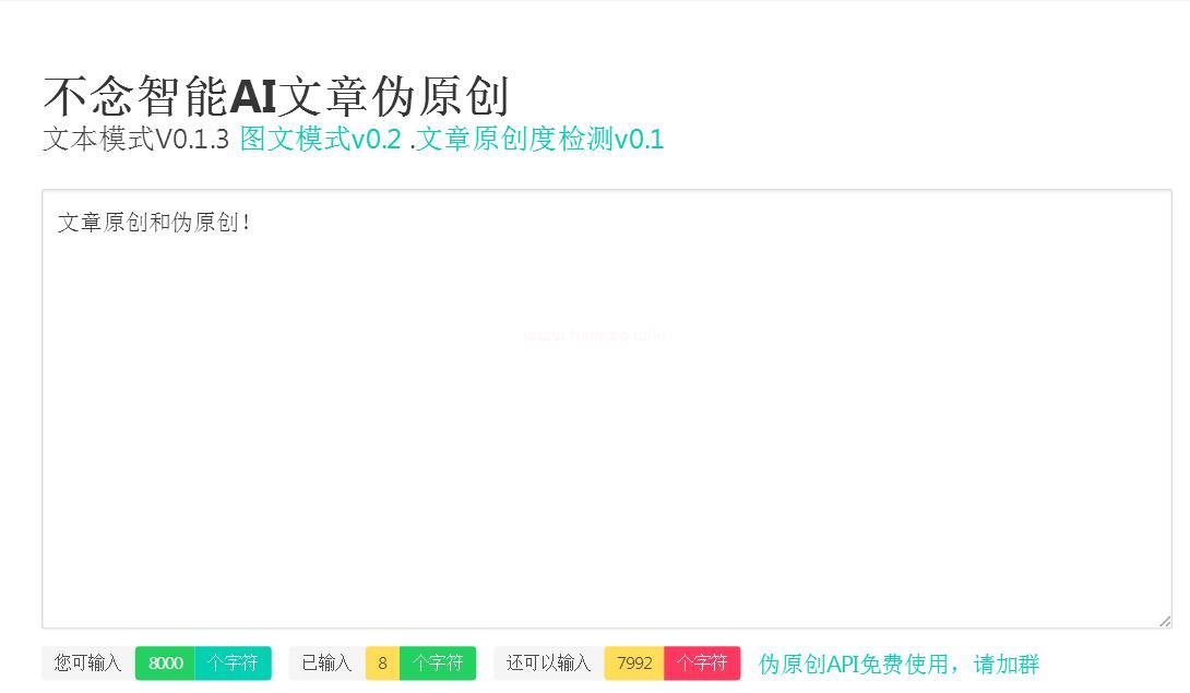 現在市面上很多Ai偽原創都是收費的,比如5118的偽原創一年是600多元,很貴的價格,那有沒有質量好的且免費的,當然你有了,大家打開這個網址“www.bunian.cn/ai”永久免費的,而且這款Ai偽原創是非常強大的,使用非常簡單,輸入文章,點擊偽原創即可,另外大家要嚴格按照我們上面說的來操作,不要偷懶,Ai偽原創一定要跟人工配合起來才能打造高質量文章的。