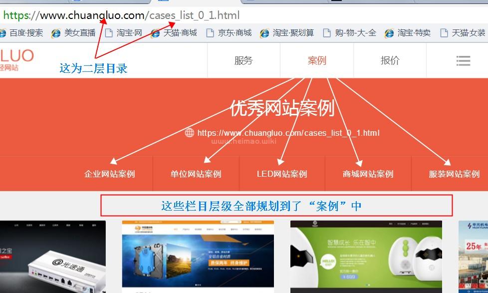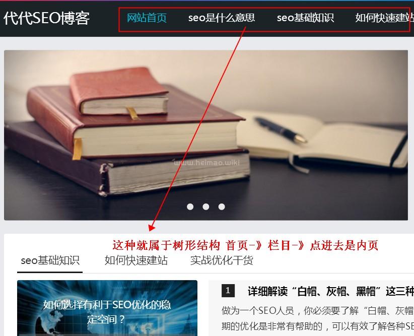 就比如黑帽百科SEO的博客,就屬于樹形結構“首頁->欄目->內頁”這種層次結構!
