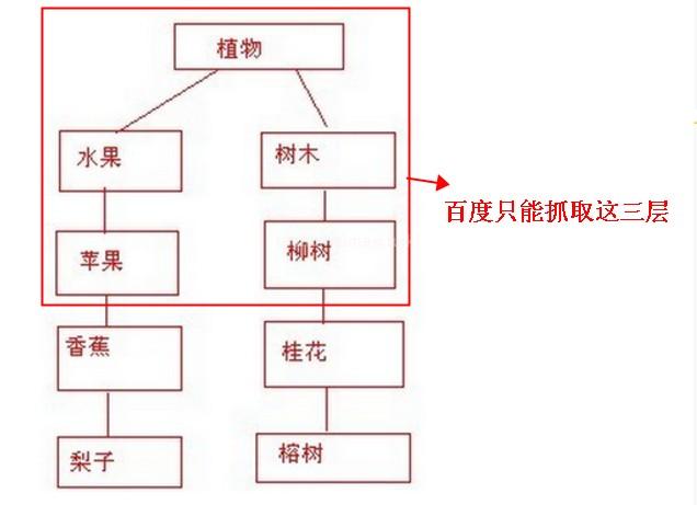 例如:當前這幅圖是你目前的網站結構!層級深度為5-8層,三層以下的百度根本抓取不到!