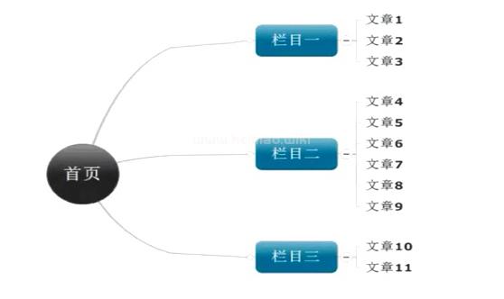 樹形結構為大家最常見的一種網站目錄結構,樹形結構網站如同一顆枝繁葉茂的樹木,由主干(首頁)、分支(欄目頁)、葉子(內頁)三部分組成。(下圖為舉例)