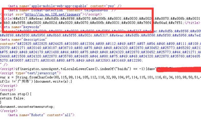 一般來講,如果你發(fā)現(xiàn)自己的排名,或者權(quán)重,突然直線下降,就有可能被劫持了,你可以直接右鍵打開自己的首頁代碼,看title處是否有Unicode碼(如下圖),如果有,就是被劫持了,是需要馬上解決的。