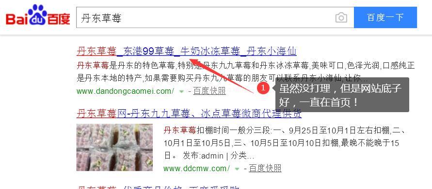 后來朋友自己做了本地實體項目,網站也賣給了本地一個女生,網站到現在為止一直都沒打理,但是排名卻依然在百度首頁,只不過不在第一的位置了,如果持續的優化,很容易就會到第一的位置,因為“丹東草莓”這個詞競爭并不難,到第一是很簡單的。(如圖)