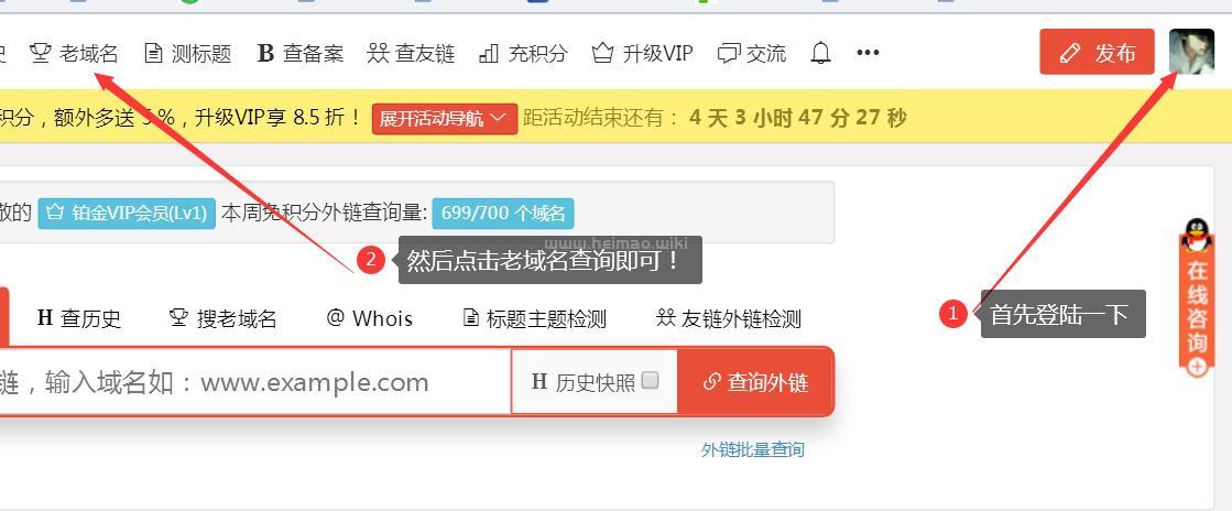 1,登錄“黑帽百科老域名”查詢網(wǎng)站!