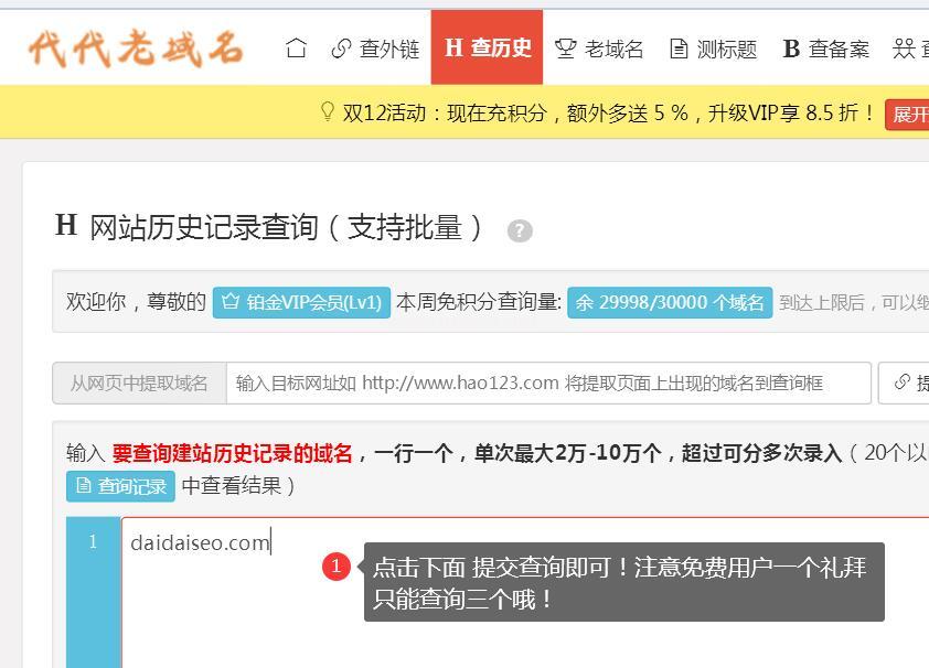 登錄以后輸入頂級域名進(jìn)行查詢,比如:daidaiseo.com然后點擊查詢即可!