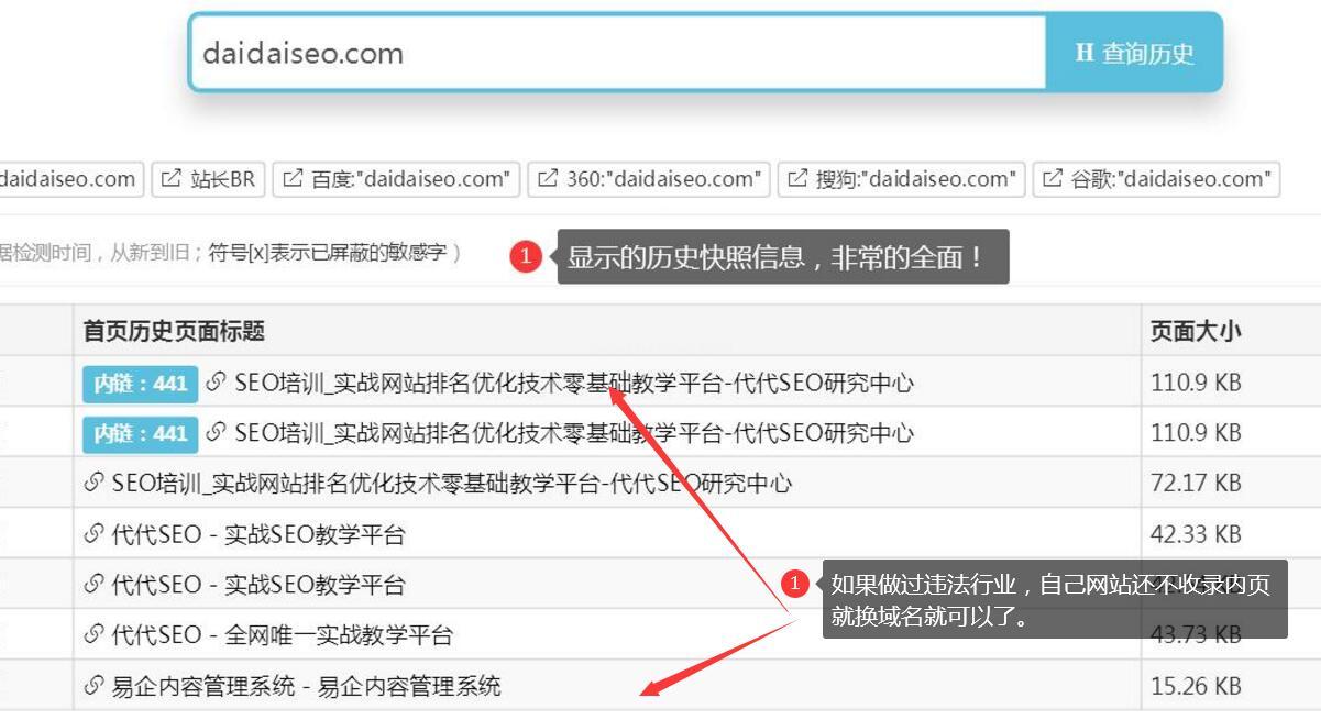 第一點,大家可以去檢查自己的域名歷史信息,是否做過一些違法的站點,被百度所屏蔽,如果有請馬上更換域名,不想解釋太多,域名歷史快照,請看這篇文章“老域名歷史信息/快照如何查詢(分享)?”如果有歷史違法快照,就換域名就可以了。