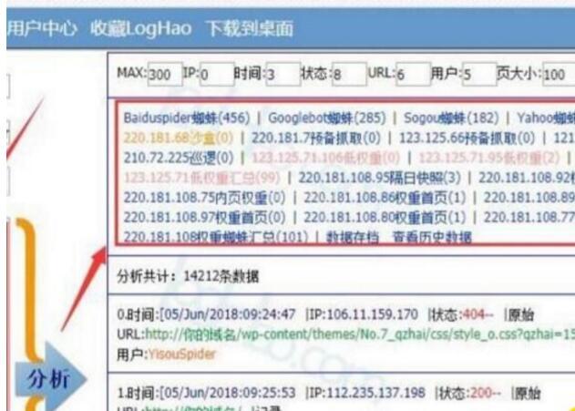 蜘蛛日志的監(jiān)控,主要是看蜘蛛每天的抓取量,高質(zhì)量蜘蛛的數(shù)量,低質(zhì)量蜘蛛的數(shù)量,如果抓取異常404、502一直保持在一定的數(shù)值,高質(zhì)量蜘蛛一直高于低質(zhì)量蜘蛛,則沒有問題,如果低質(zhì)量蜘蛛比較高,出現(xiàn)了降權(quán)蜘蛛,我們就要進(jìn)行排查網(wǎng)站了(蜘蛛日志使用loghao在線分析)!