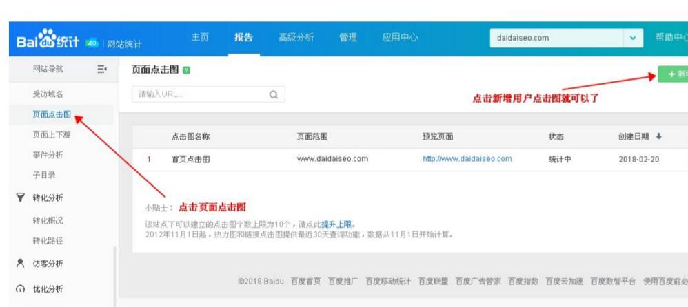 首先我們進入百度統(tǒng)計,注冊一個百度站長賬號,當我們注冊成功以后,百度統(tǒng)計會提示驗證網站,我們可以通過自己安裝代碼,同時也可以提供FTP讓百度自動安裝,我建議我們手動安裝,畢竟百度是機器,出錯的幾率較高,如果不會安裝的,可自動安裝,安裝之前最好備份。在我們安裝好百度統(tǒng)計的時候,我們可以看到百度統(tǒng)計頁面的左邊有一個頁面點擊圖的按鈕,我們點擊進去,進去以后可以看到右上角有一個“+新增點擊圖”的按鈕,當我們要統(tǒng)計哪個頁面我們就可以添加哪個頁面,一般情況下我們都是添加首頁和欄目頁,不建議添加內容頁,因為我們的內容頁面比較多,每一頁都添加相對麻煩。