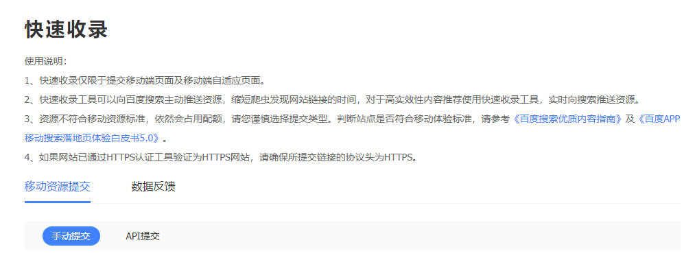 快速收錄工具只適用于移動端網站頁面及自適應網站頁面,可以幫助站長更好的向搜索引擎推送內容資源,對于優質時效性高的內容推薦使用快速收錄工具,實時向百度搜索推送優質內容資源。