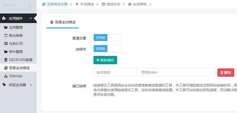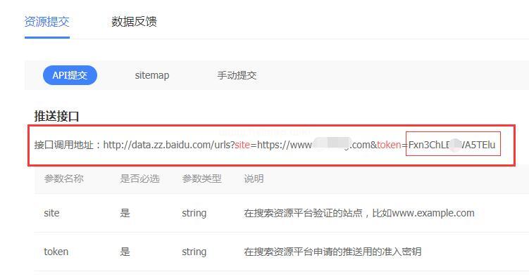 站點(diǎn)域名就填寫(xiě)當(dāng)前網(wǎng)站的域名就行,密鑰token需要在百度站長(zhǎng)平臺(tái)認(rèn)證網(wǎng)站,才可以得到密鑰token,認(rèn)證好以后,登錄百度站長(zhǎng)平臺(tái),點(diǎn)擊“普通收錄-資源提交-API提交”下面有個(gè)推送接口,這樣我們就可以看到密鑰token了,如下圖所示: