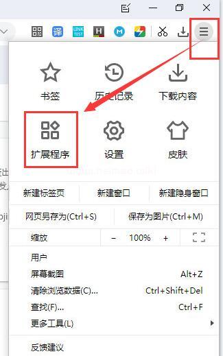 2、打開小智雙核谷歌瀏覽器,單擊瀏覽器右上角的“三橫”那個按鈕,然后打開小智雙核谷歌瀏覽器擴展程序,如下圖所示:
