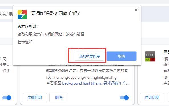 4、接著會彈出一個對話框,詢問你是不是要添加“谷歌訪問助手”,我們選擇“添加擴展程序”按鈕。