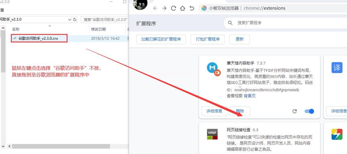 3、打開小智雙核谷歌瀏覽器擴展程序后,可直接將自己電腦本地“谷歌訪問助手插件包”拖動到“小智雙核谷歌瀏覽器擴展程序”中,如下圖所示: