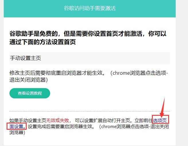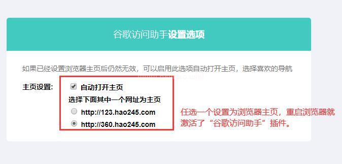 在以下截圖中,任選一個設置為瀏覽器主頁,重啟瀏覽器就激活了“谷歌訪問助手”插件了。