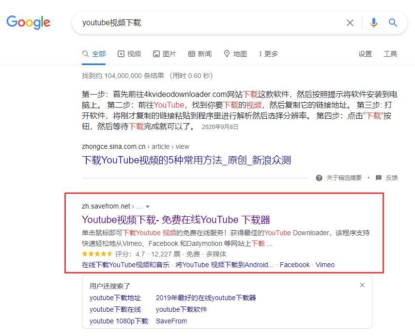有些地方可能仍然打不開savefrom.net網(wǎng)站,即使可以打開,但速度仍然是很慢的,谷歌搜索上搜索“youtube視頻下載 ”找到“savefrom”這個網(wǎng)站,截圖如下: