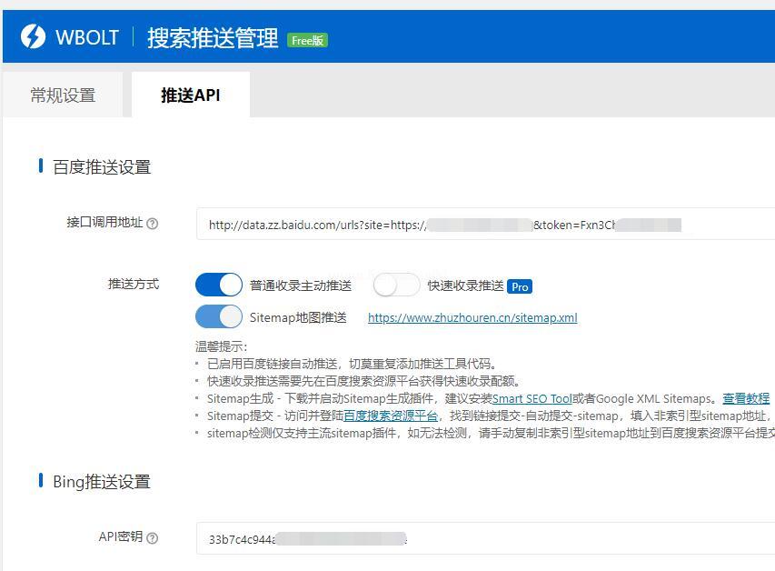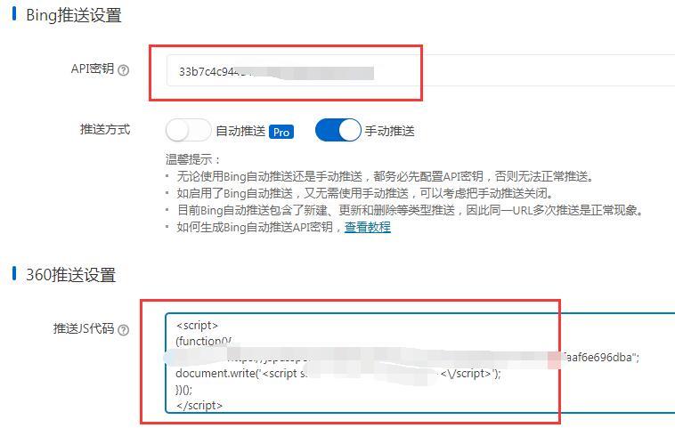 還支持填寫必應搜索的API密鑰和360搜索自動推送的JS代碼,如下圖所示: