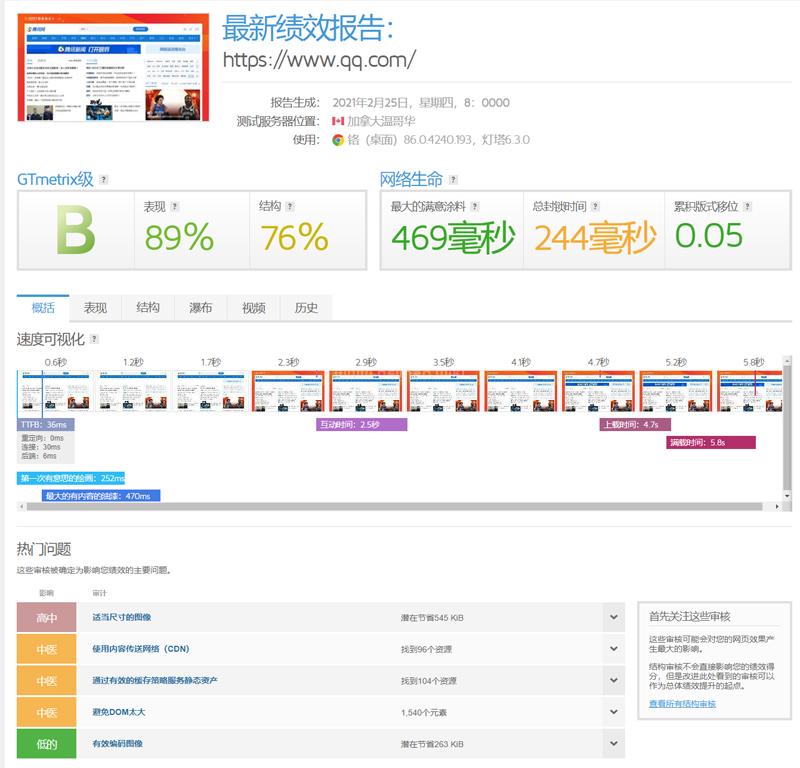 下面先給分享幾個海外知名的網站測速工具,可以通過這個網站測試你的網站分值,下面黑帽百科拿了騰訊的網站測試了一下。