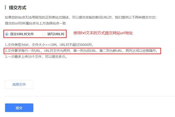 1、提交的網站URL鏈接對文件格式必須為txt,且大小要小于或等于10兆,對數不能超過50000對;
