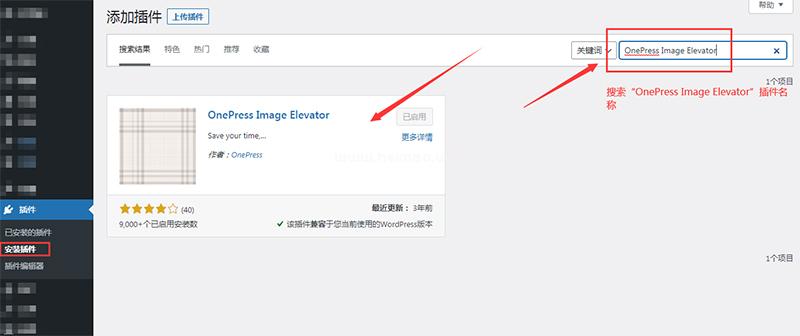 1、登錄Wordpress后臺,點擊“插件”菜單,搜索“OnePress Image Elevator”插件名稱,如下圖所示: