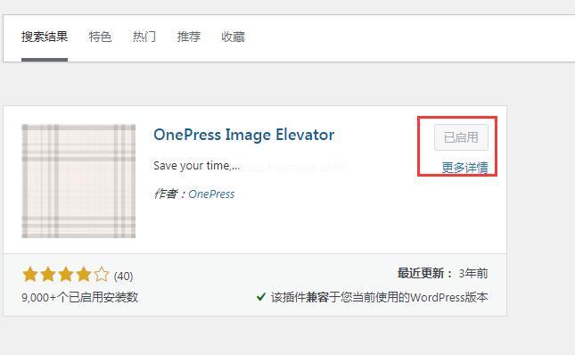 2、搜索到“OnePress Image Elevator”插件名稱后,安裝并啟用此插件,安裝啟用后的插件如下圖所示: