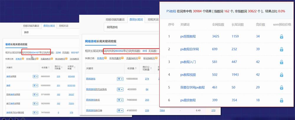 例如上圖中我們挖掘的關鍵詞“裝修”,有幾十上百萬個關于裝修的關鍵詞,搜索“網絡游戲”也有二十多萬個關鍵詞,搜索“PS教程”有三萬多個關鍵詞,有的是有指數有流量的關鍵詞,有的是無指數低流量的關鍵詞,有指數的關鍵詞流量會高一點,無指數的關鍵詞我們也需要優化,主要是看可以獲得多少這樣的關鍵詞,網站關鍵詞數量越多,網站流量就越多,只要我們將這些關鍵詞全部進行優化,網站流量就可以提高上來,因此網站關鍵詞的詞庫主要還是要靠站長自己去挖掘,多利用工具平臺去拓展更多與網站定位相關的關鍵詞,無論是有指數還是無指數關鍵詞,都可以收集,再后期進行分析與篩選,找出與我們網站定位匹配的關鍵詞,只要這個關鍵詞有流量有用戶搜索需求,都可以收集到我們網站關鍵詞的詞庫中。