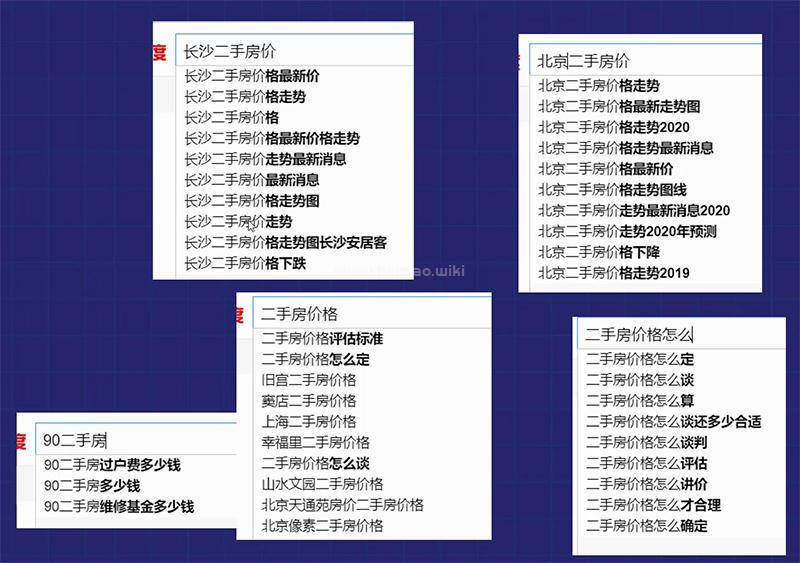 通過上圖中“長沙二手房價格走勢、北京二手房價、二手房價格、二手房價格怎么定、90二手房多少錢”這些關鍵詞我們可以將這些關鍵詞進行分類,根據不同的地區進行劃分,我們就可以導出海量的關鍵詞,無論是價格、走勢,還是價格怎么定之類的關鍵詞,通過拓詞功能基本上就可以找出這個行業所有的關鍵詞供我們網站使用。
