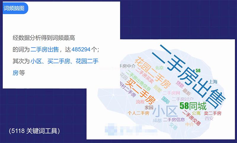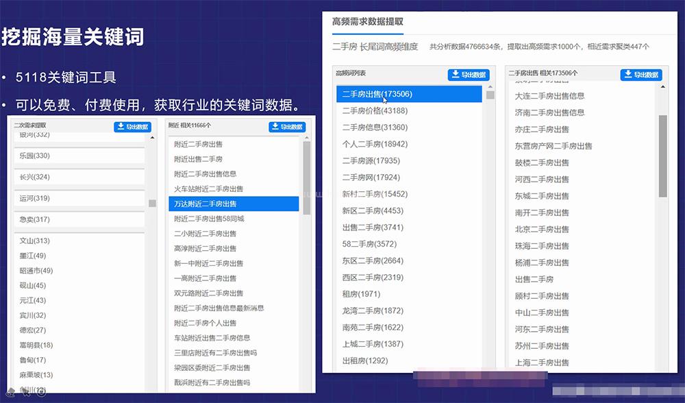 下面我們以“二手房”這個關鍵詞來給大舉例說明,如下圖所示,找出了近50萬個關鍵詞,例如像“二手房出售、花園二手房”這些關鍵詞都是用戶搜索頻率很高的關鍵詞,根據這些關鍵詞再進行二級三級延伸挖掘。