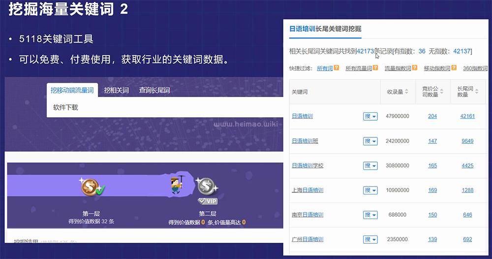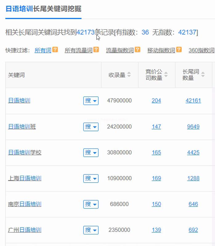 5188關鍵詞移動端挖掘工具,例如以“軟件下載”為例進行搜索,可以通過一級、二級、三級、四級的方式去挖掘,最高可以挖到五級,不同級別的帳號挖掘關鍵詞的級數也是不同的,搜索“日語培訓”可搜到4000多條記錄,每條記錄我們可以再進行挖掘,例如“日語培訓班”可以挖掘9600多條、日語培訓學校有4000多條”,每個關鍵詞挖掘的記錄我們還可以進行導出來分析篩選,篩選出與我們網站行業相關的關鍵詞供我們使用,至于要如何用,就要看我們對于自己所在行業的理解了。