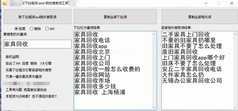 下圖中也是一個關鍵詞挖掘工具,例如搜索“家具回收”,點擊“取下拉框詞and相關搜索詞”就可以一下子將百度下拉關鍵詞找出來,還可以找出底部的相關搜索關鍵詞,有了這樣的工具可大大提高我們的工作效率。