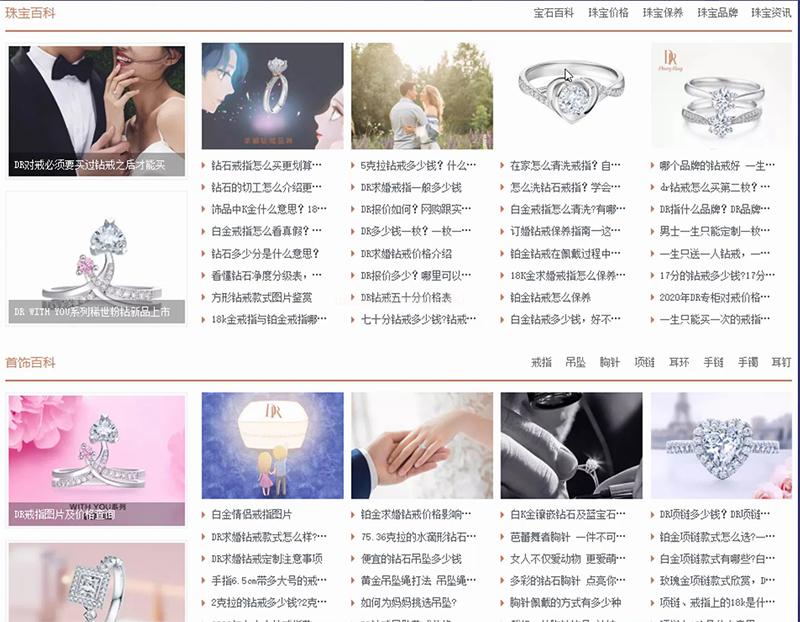 上圖為行業資訊新聞站,有著海量的資訊內容,例如珠寶類的百科,百科又分為價格、保養、品牌、資訊,首飾類的百科,又可以分為吊墜、鉆戒,我們再進行細分,就可以獲得海量的內容,將這些內容我們就可以做成一個新聞資訊站,比如問答、資訊等,這些都是我們可以使用的,而且基本所有行業都可以使用這種方案,實現網站內容的更新和海量詞庫的優化,當網站有了流量以后,進流量導入到產品購買頁面,這種流量用戶一般都是很精準的,很容易就轉化了。