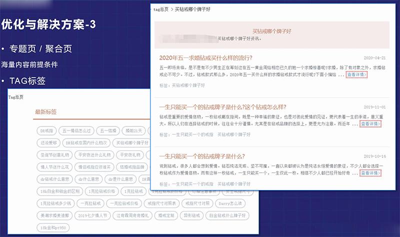 上圖中某個電商網站的專題頁,例如“買鉆戒哪個牌子好”,下面內容都是關于鉆戒哪個牌子好的相關內容,這樣的頁面就是專題頁面,只要與鉆戒哪個牌子好相關的內容全部匯總在這個頁面,tag標簽頁面,也有大量關于鉆戒哪個牌子好的相關標簽,每一個tag標簽都是一個關鍵詞,點擊進去都是關于鉆戒的內容,將同個關鍵詞的內容進行聚合,形成一個新的網站頁面,這種頁面就稱之為專題頁或聚合頁。